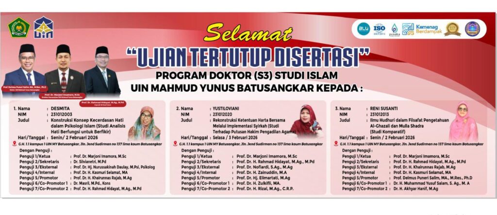Melalui capaian ini, UIN Mahmud Yunus Batusangkar menegaskan posisinya sebagai salah satu perguruan tinggi keagamaan Islam negeri yang terus bertransformasi dan berkontribusi dalam melahirkan sumber daya manusia unggul di tingkat doktoral, khususnya dalam bidang Studi Islam. (hospiburda)